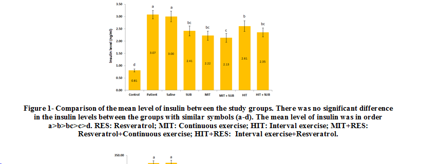 The mean levels of blood glucose and insulin in each group are presented in figures 1 and 2. The mean concentrations of blood glucose and insulin in the patient and saline groups were significantly higher than in other groups (p<0.0001). In addition, RES supplementation alone or in combination with interval or continuous exercises significantly reduced the blood glucose and insulin levels compared with the patient and saline groups (p<0.001). Combined therapy with RES and exercise was more effective in reducing blood glucose and insulin levels. The control group had significantly lower blood glucose and insulin levels compared with the other groups (p<0.01).