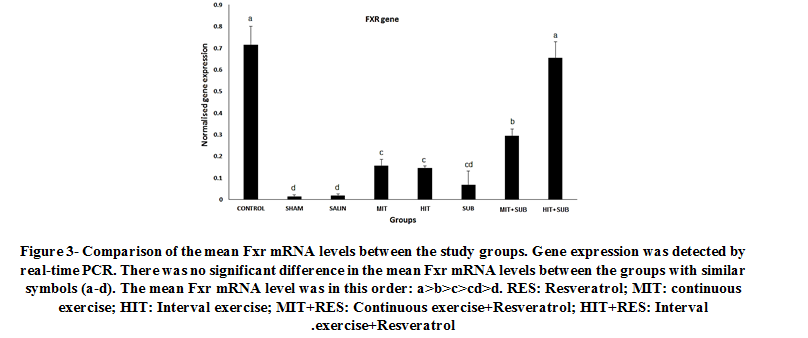 A significant difference was found in the expression pattern of Fxr, Lxr, and Sirt1 between the study groups (Figures 3, 4, and 5). The expression of Fxr was significantly higher in the control and HIT+RES groups compared with other groups (p<0.0001). However, the expression of this gene in the sham and saline groups was significantly lower than in other groups (p<0.001). The Fxr mRNA expression in the HIT and MIT groups was higher than in the saline groups (Figure 3) (p<0.01).