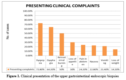 Among the patients, 72.80% presented with dyspepsia, while 64.20% reported dysphagia. Other chief complaints included abdominal pain, retrosternal burning, vomiting, loss of appetite, weight loss, and nausea. (Figure1)