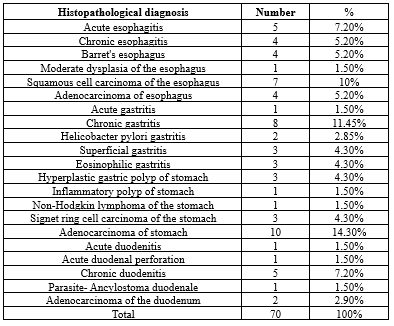The present study was conducted at our tertiary care center on 70 patients to assess the histopathological spectrum of various upper GIT lesions in relation to clinical and endoscopic findings, as well as to determine their frequency of occurrence based on age and sex.