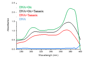 Figure 1. Ultraviolet spectra of control-DNA, DNA + Tamarix aphylla, DNA + glucose + Tamarix aphylla, and DNA + glucose after 4 weeks of incubation at 37 ºC in 200 mM phosphate buffer pH 7.4