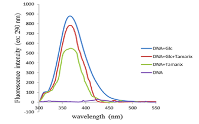 Figure 2. Fluorescence intensities of control-DNA, DNA + Tamarix aphylla, DNA + glucose + Tamarix aphylla, and DNA + glucose after 4 weeks of incubation at 37 ºC in 200 mM phosphate buffer pH 7.4
