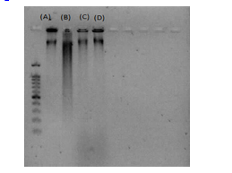 Figure 4. Agarose gel electrophoresis of native and modified DNA after 4 weeks of incubation at 37 ºC in 200 mM phosphate buffer pH 7.4: Lane (A), native DNA; Lane (B), DNA + glucose; Lane (C), DNA + Tamarix aphylla; Lane (D), DNA + glucose + Tamarix aphylla.